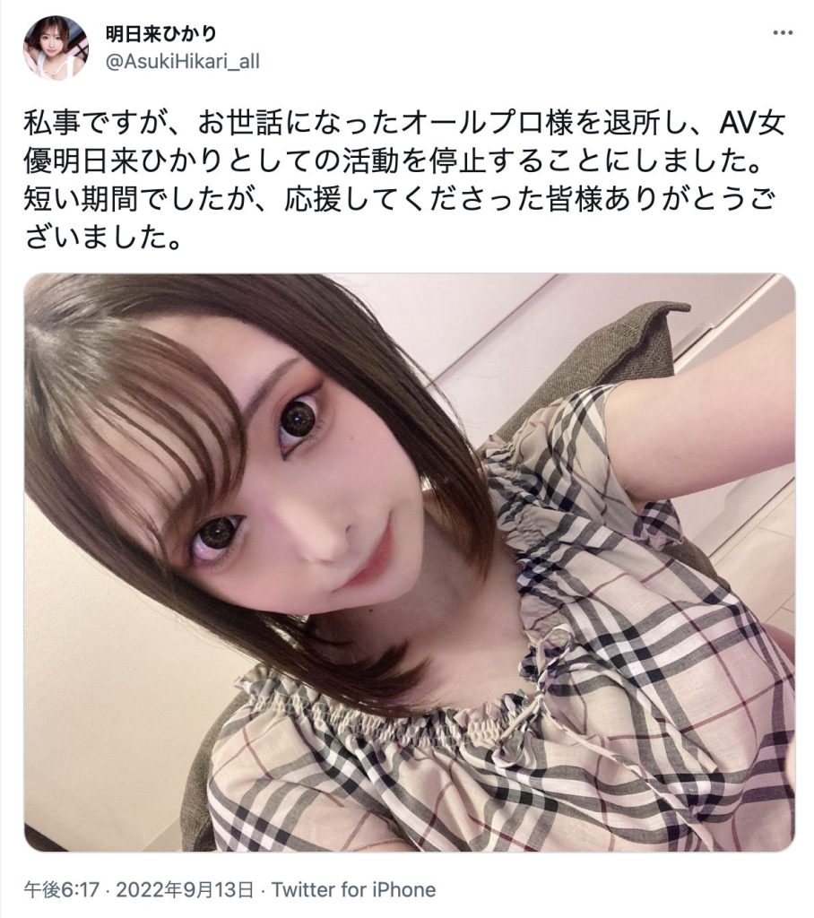 2022年7月12日、アイデアポケット(レーベル:アイポケ逸材発掘プロジェクト)よりAVデビュー。オールプロ所属。公式Twitter(@AsukiHikari_all)も公開されています。