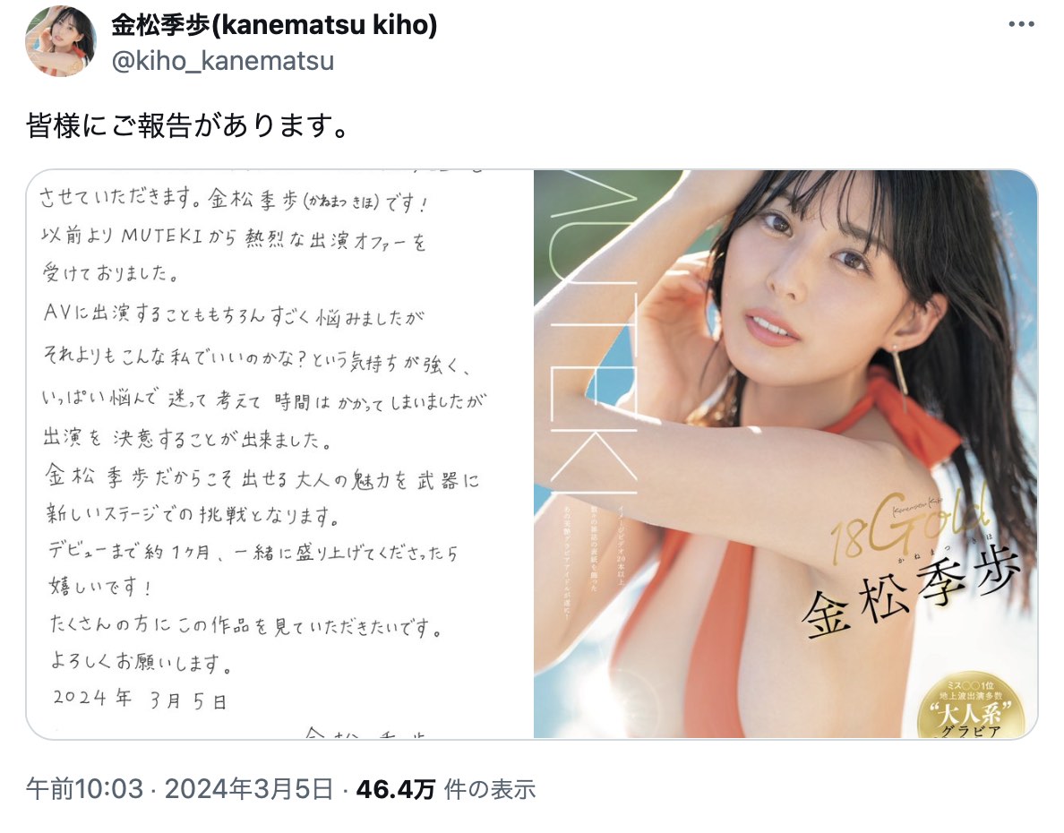 2024年2月に芸能活動を再開、金子智美から金松季歩に改名を公表し、2024年3月5日に自身のTwitterでMUTEKIよりAVデビューすることを報告。