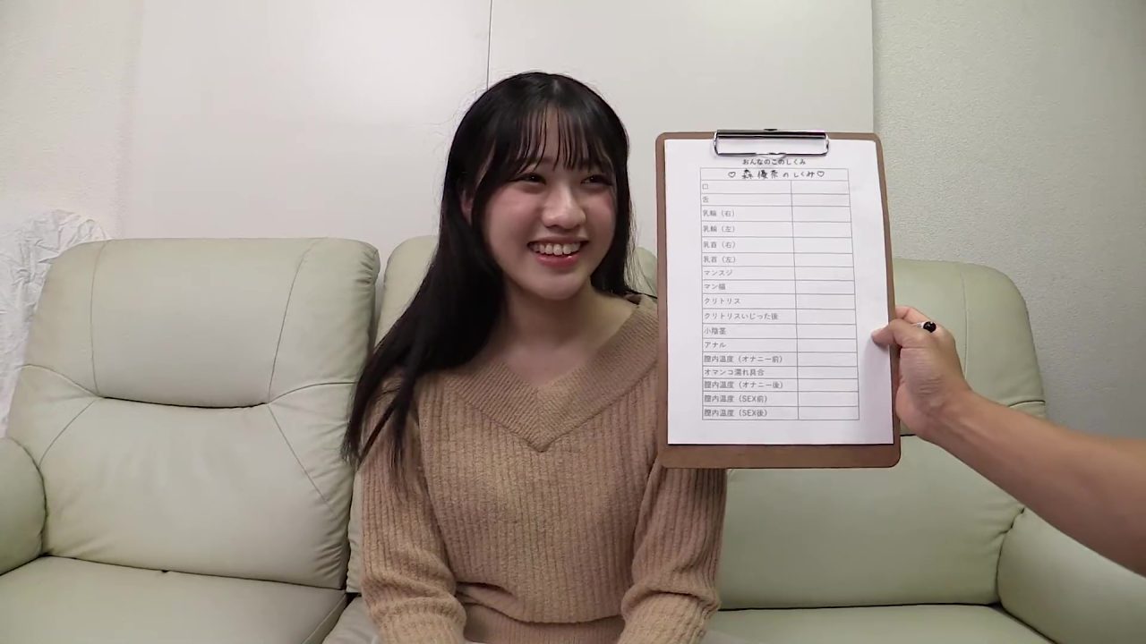 企画説明→口の大きさ測定→乳首測定→オマンコ測定→セックス前膣内温度測定→愛撫→フェラチオ→69→正常位で生挿入→バック→背面側臥位→騎乗位→背面騎乗位→正常位で中出し→セックス後膣内温度測定