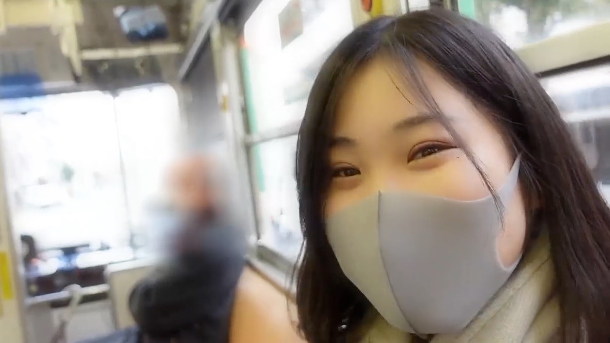 待ち合わせをして路面電車で合格祈願の神社へ。制服姿でマスク着用。ガチで高校生に見えますが真偽は?